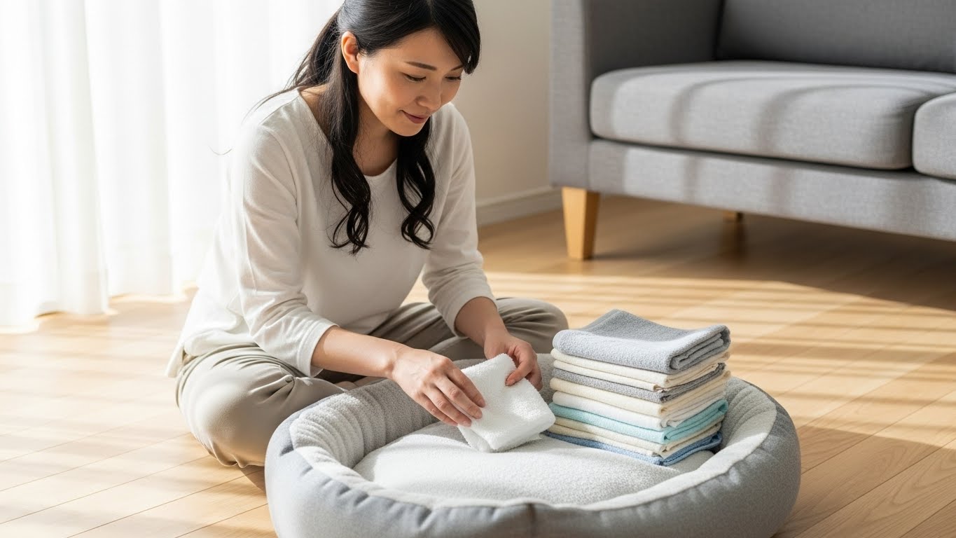 ベッドの上に、飼い主さんのにおいがついたタオルや衣類を置いてみましょう。
